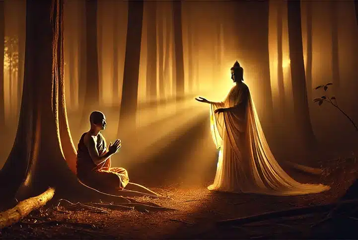 Buddha said, ‘Yeah, go ahead! You want my finger?’ But Angulimala could not! The amount of light and love just shook Angulimala. He fell at the feet of Buddha. And then he became a Bhikshu (disciple). Buddha taught him meditation. He also changed his name. Everything in him changed. And people could not believe that. Angulimala was doing very strict austerities, staying with Buddha. Buddha taught him how to see the tension and irritation, frustration, and ignorance in him that propelled him to do such work, and when they all fell apart, he was such a wonderful person.