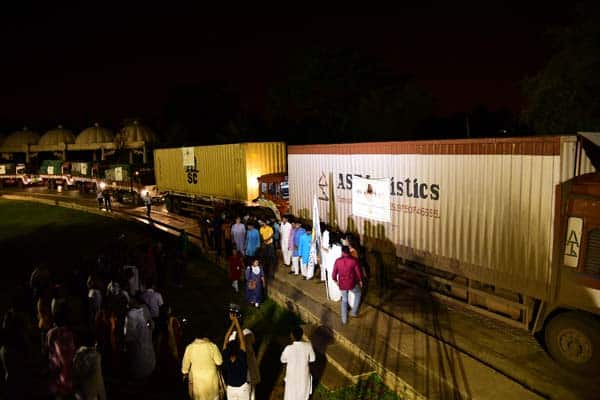The Art of Living has sent 60 truckloads of relief material comprising 500 tons of essential items. These items including clothes, water, sanitary napkins, staple food, medicines, other essentials and toiletries provided by Sri Sri Tattva were collected from the Art of Living International Center, Bangalore, Chennai, Hyderabad, Nagpur, Kolkata and other locations.