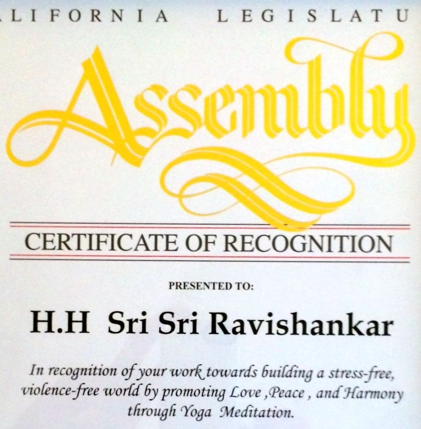 Gurudev Sri Sri Ravi Shankar received a Certificate of Recognition from the California Legislature Assembly on June 30, recognizing the efforts towards building a stress-free world by promoting love, peace and harmony through yoga and meditation.