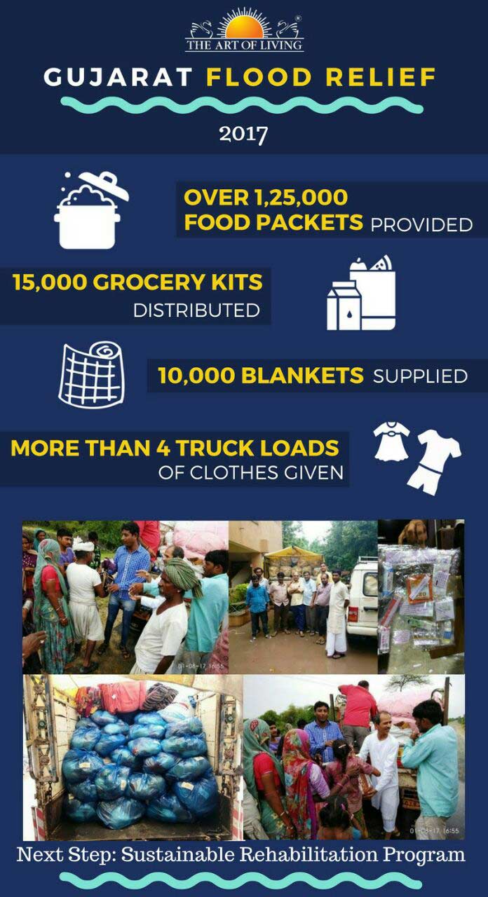 The Art of Living has been working in the flooded areas of Gujarat since 24th July, 2017. Through its volunteer network the organization has so far distributed 1.27 lakh food packets, 15,000 ration kits that can feed a family of four for 10 days, 10,000 blankets and truckloads of clothes in 48 villages and highly affected Banaskantha, Patan and Surendranagar districts. The organisation is now planning sustainable trauma relief and long-term rehabilitation measures as well.
