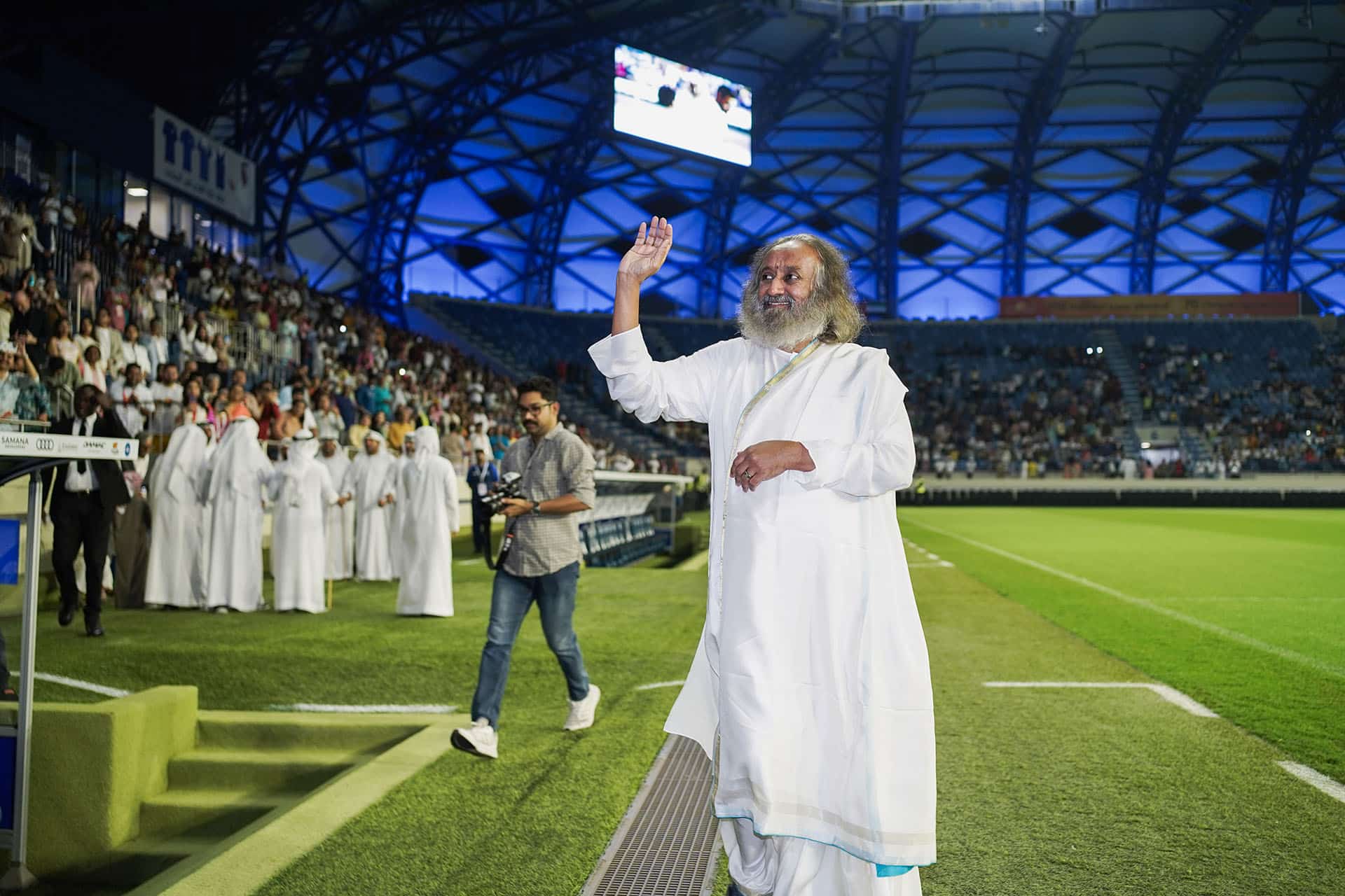 Gurudev led thousands from different parts of UAE during a public event at the Al Maktoum Stadium in Dubai. The atmosphere buzzed with jubilation as he traversed the stadium’s perimeter, engaging closely with enthusiastic attendees.